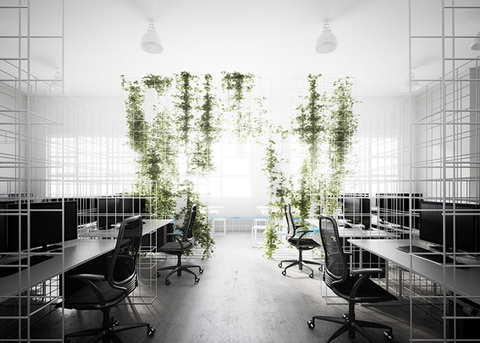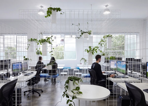 Cây xanh là một phần quan trọng của không gian văn phòng này với thiết kế Biophilia - nâng cao sự thoải mái tại nơi làm việc. Xu hướng Biophilic Design xuất phát từ nhu cầu sinh học bẩm sinh của con người là được kết nối với thiên nhiên, từ đó, những bản thiết kế xây nhà ở và văn phòng gần gũi thiên nhiên được ra đời. Biophilia được ưa chuộng và phổ biến với việc kết hợp các yếu tố tự nhiên vào môi trường xây dựng. Thiết kế văn phòng ở Úc củaSquint/Opera sử dụng những chậu hình hộp chữ nhật để trồng những loại dây leo và lắp chúng vào hệ thống “ma trận” lưới xung quanh, củng cố không gian khi chúng phát triển.